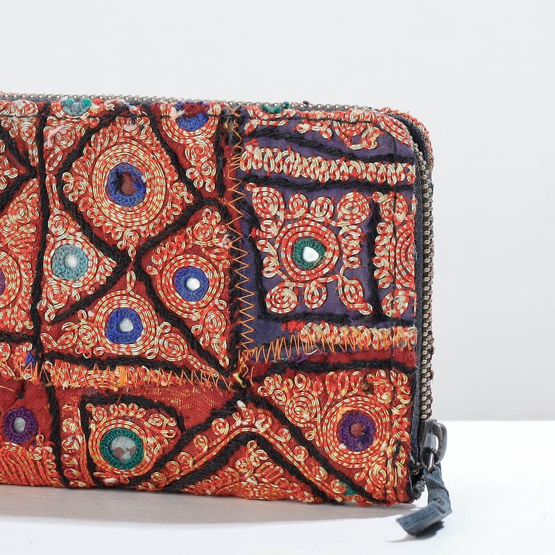 This vintage wallet is handcrafted from cotton fabric and is adorned with exquisite Banjara hand embroidery. It has three sections, four card slots, and a zipper pocket inside. Lambani or Banjara embroidery is a combination of colorful threads, design patterns, mirror work, stitching patterns applique or patch work. The wallet is made by expert artisans from Kutch, Gujarat.