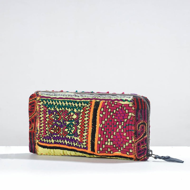 This vintage wallet is handcrafted from cotton fabric and is adorned with exquisite Banjara hand embroidery. It has three sections, four card slots, and a zipper pocket inside. Lambani or Banjara embroidery is a combination of colorful threads, design patterns, mirror work, stitching patterns applique or patch work. The wallet is made by expert artisans from Kutch, Gujarat.