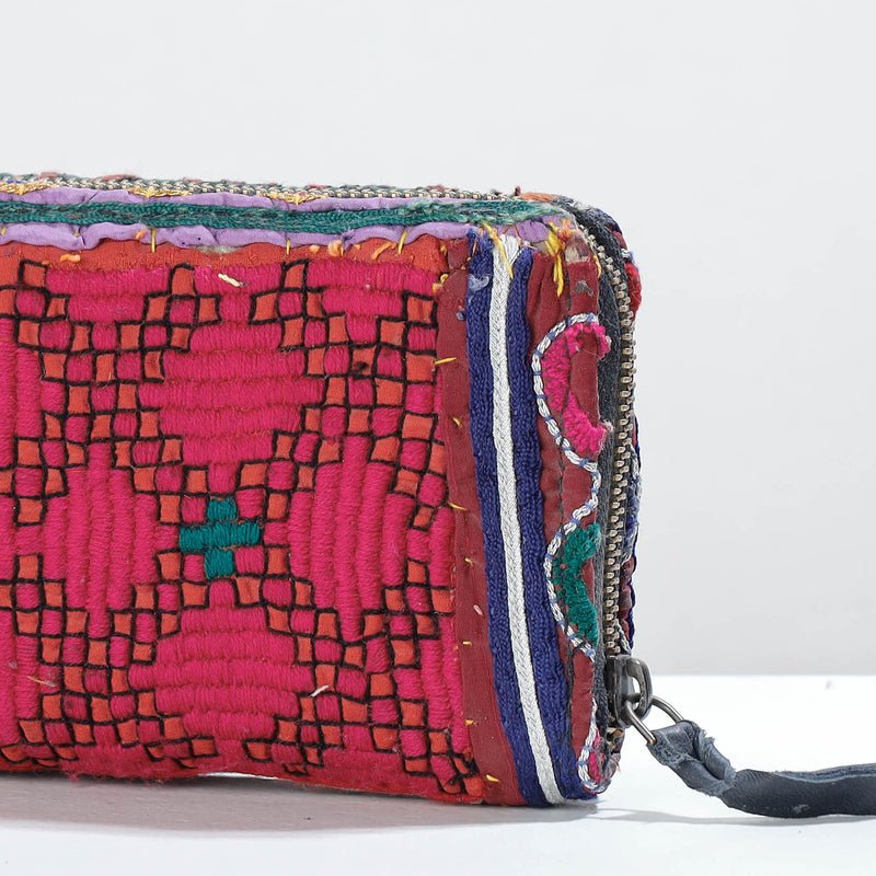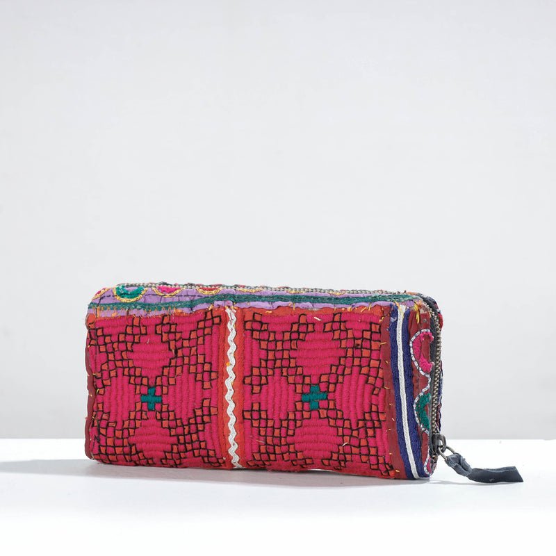 This vintage wallet is handcrafted from cotton fabric and is adorned with exquisite Banjara hand embroidery. It has three sections, four card slots, and a zipper pocket inside. Lambani or Banjara embroidery is a combination of colorful threads, design patterns, mirror work, stitching patterns applique or patch work. The wallet is made by expert artisans from Kutch, Gujarat.