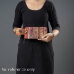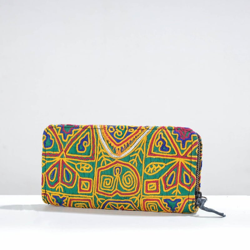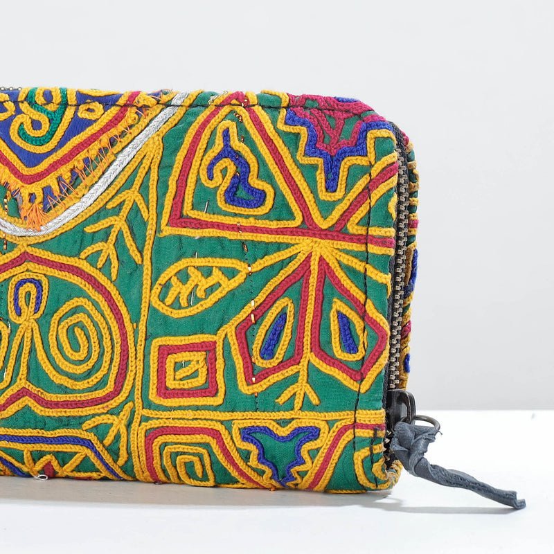 This vintage wallet is handcrafted from cotton fabric and is adorned with exquisite Banjara hand embroidery. It has three sections, four card slots, and a zipper pocket inside. Lambani or Banjara embroidery is a combination of colorful threads, design patterns, mirror work, stitching patterns applique or patch work. The wallet is made by expert artisans from Kutch, Gujarat.