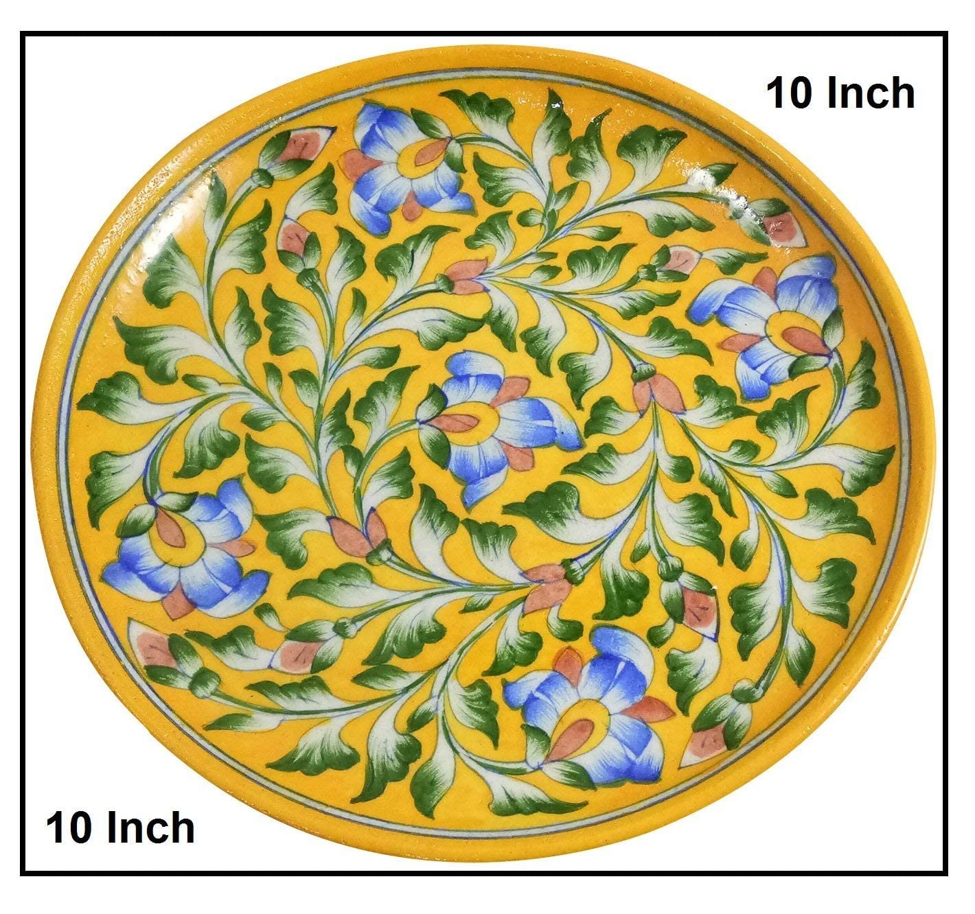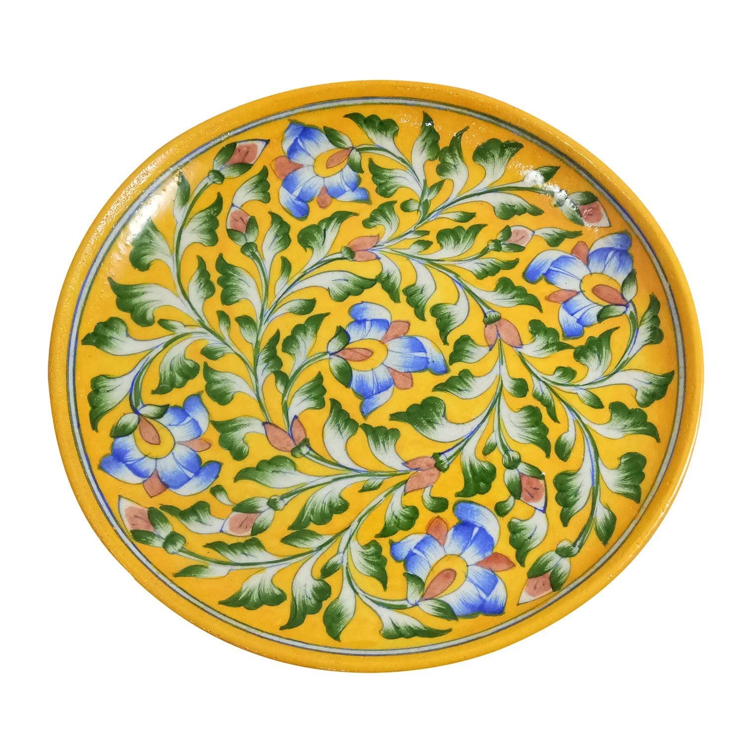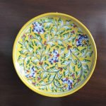 This plate is handmade and hand-painted using one of the most popular and geographically indexed pottery technique from India – Blue Art Pottery. It is made by an awarded Indian artisan. The plate is completely handglazed and hand-painted using acrylic colors. Various shapes, sizes and designs are possible for a small batch production of 100 pieces. Existing designs are available for a minimum quantity of 24 pieces.