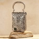 A silver color unique metal hand clutch purse from the indian craftsmen. Handmade vintage hand clutch made from brass metal. A basic brass metal object is first designed and fine carving is done on it by hand. The process is finally completed by oxidization and polishing. Wall of the inner space is also fixed with soft velvet to protect your items.