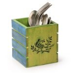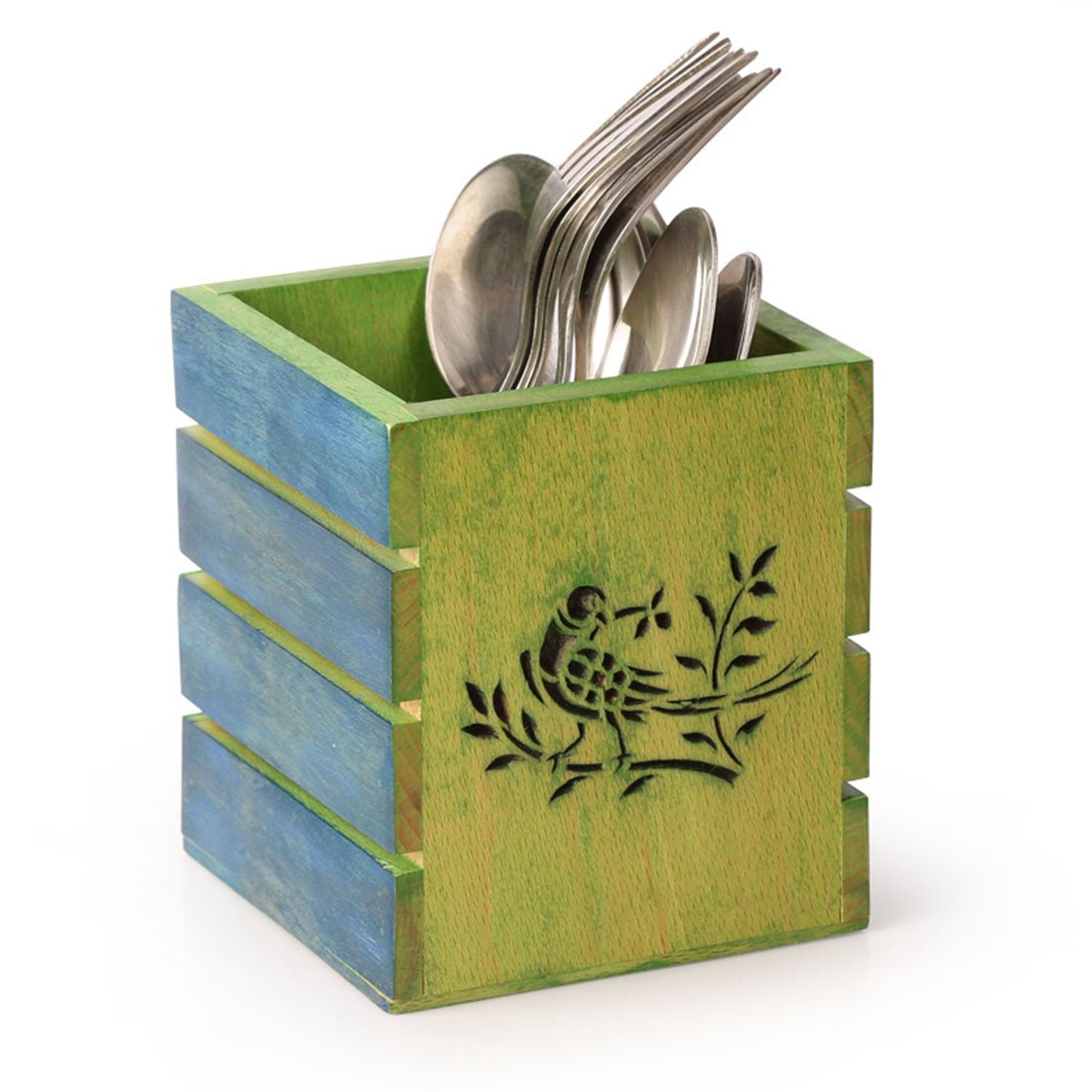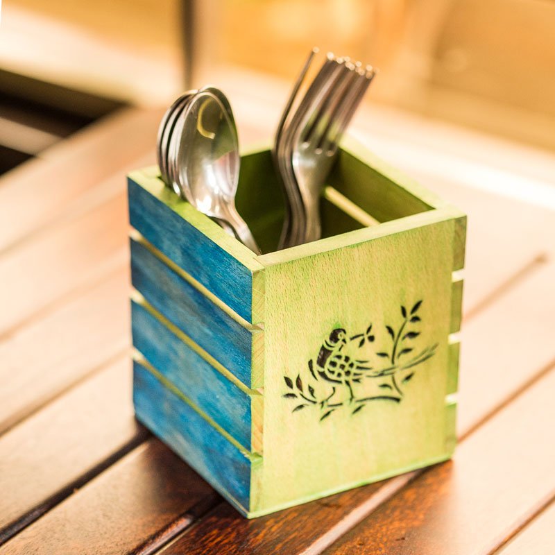 The cutlery holder or table organiser is made from seasoned beech wood by master craftmen of West Bengal. The motifs are handmade and hand painted. They can be customised. The configuration of the holder can also be customised for a small bacth production of 100 units.
