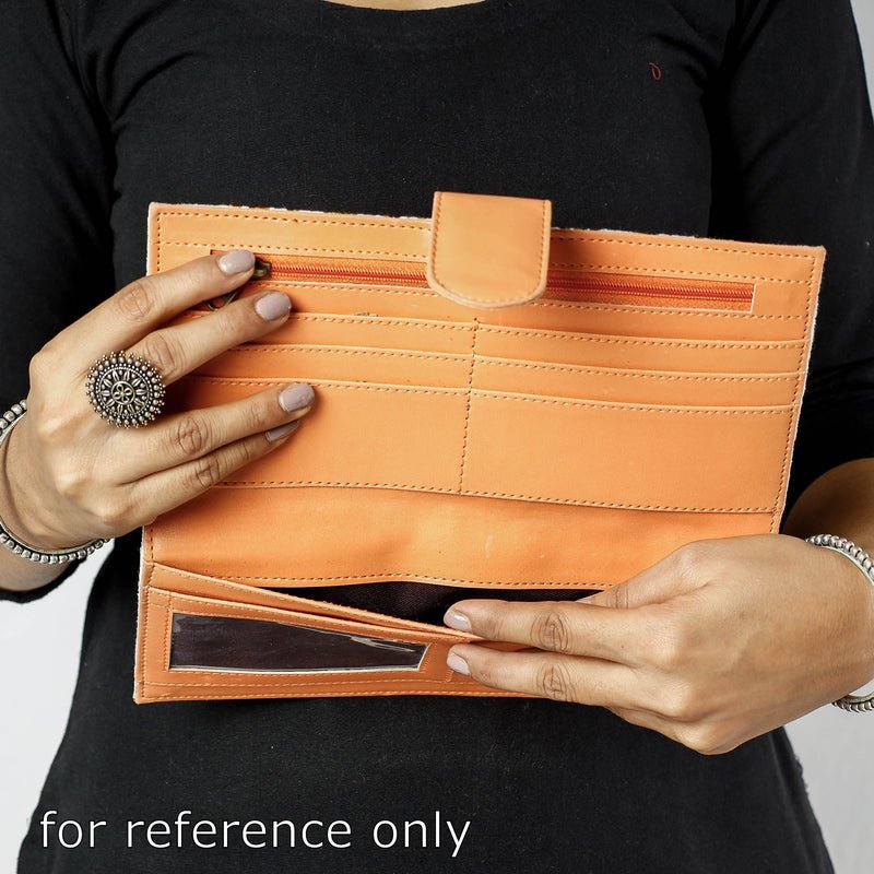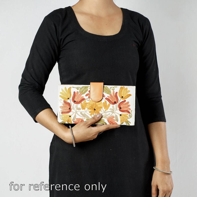 The wallet cover is made from velvet fabric and handcrafted using Crewel work surface embroidery by expert artisans from Kashmir. The inside lining is of vegetable tanned leather. It has multiple card slots, cash and zipped compartments. It has a magnetic button closure. The embroidery design and formation can be customised for a small batch production of 100 units.