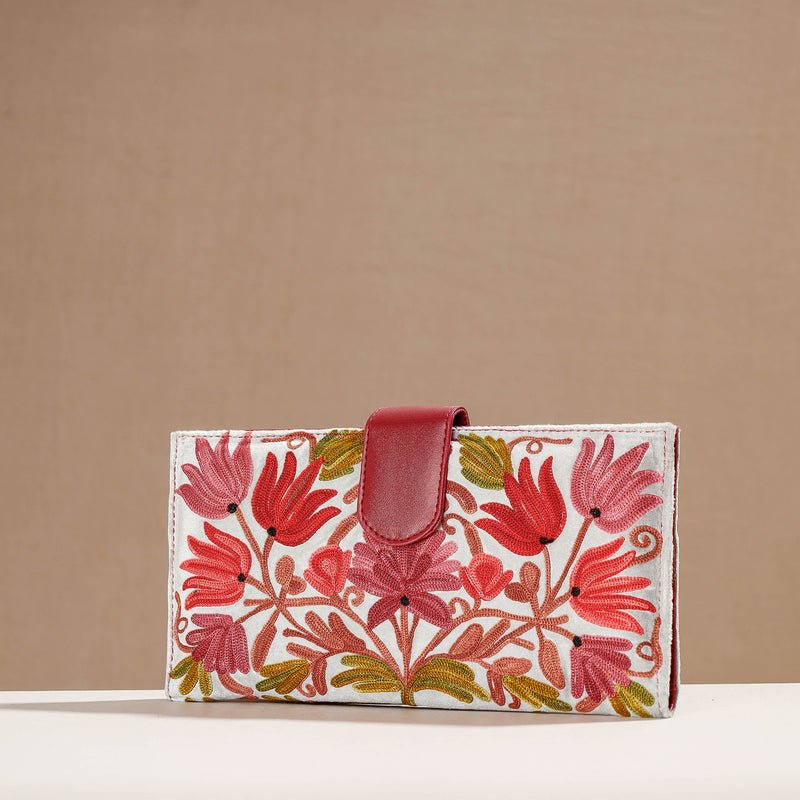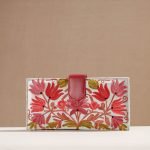 The wallet cover is made from velvet fabric and handcrafted using Crewel work surface embroidery by expert artisans from Kashmir. The inside lining is of vegetable tanned leather. It has multiple card slots, cash and zipped compartments. It has a magnetic button closure. The embroidery design and formation can be customised for a small batch production of 100 units.