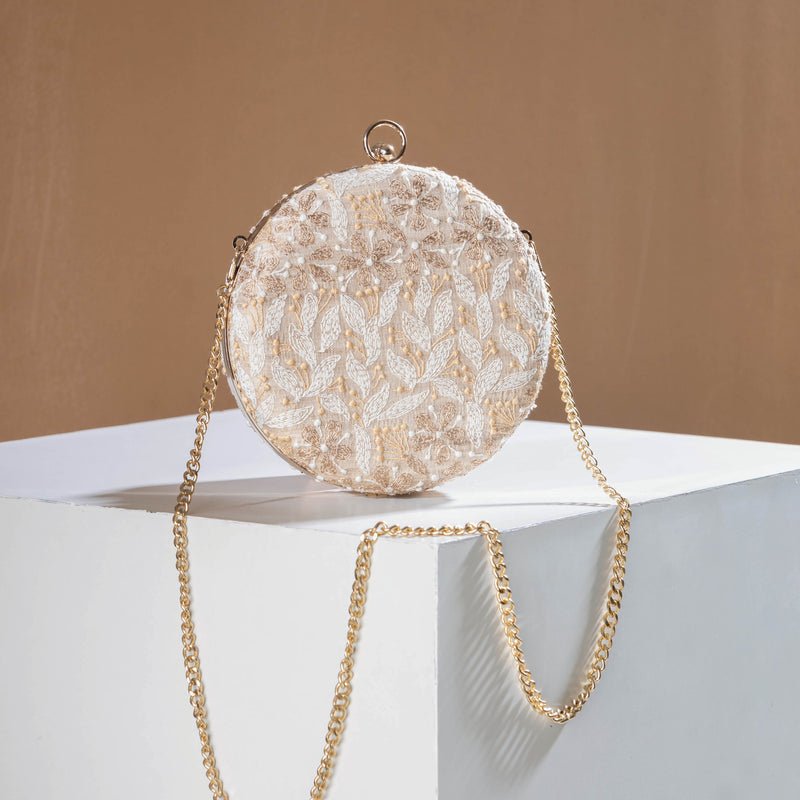 This hand embroidered raw silk clutch is handcrafted by master Zardozi artisans from Lucknow, Uttar Pradesh. There is a Silk lining inside. Zardozi is a special form of embroidery that used metallic-bound threads to sew embellishment on to various fabrics. Zardozi embroidery work involves making elaborate designs, using gold and silver threads. We can create customize designs in Zardozi.