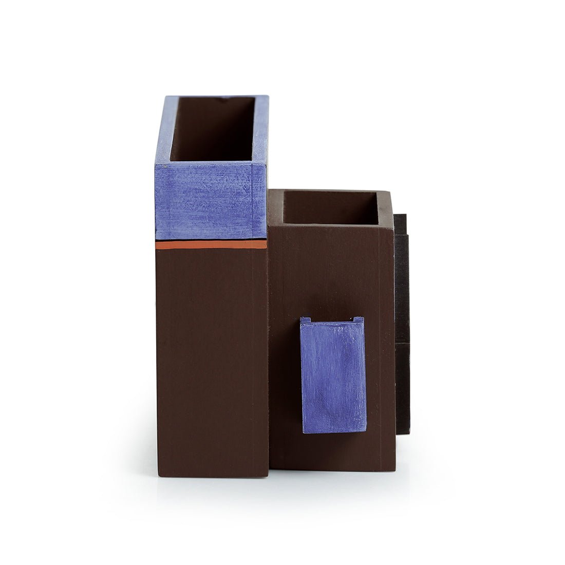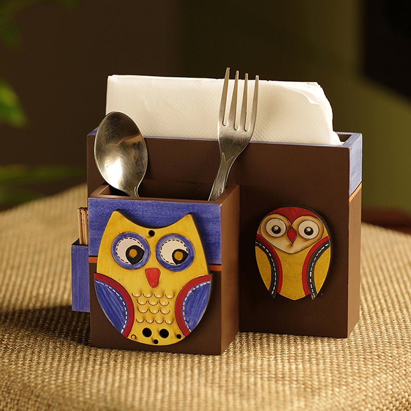 The cutlery holder or table organiser is made from seasoned pine wood by master craftmen of West Bengal. The motifs are handmade and hand painted. They can be customised. The configuration of the holder can also be customised for a small bacth production of 100 units.