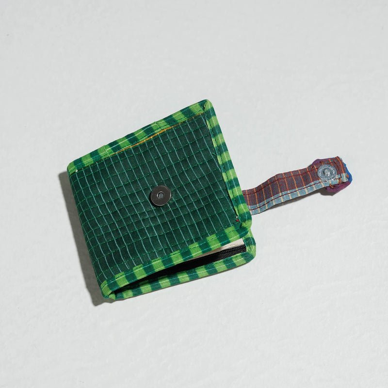 This handcrafted Gamcha fabric cotton wallet is handcrafted by Rangila Dhaga. It has one simple pocket, six card slots, one zipper pocket inside. Unique contemporary style.