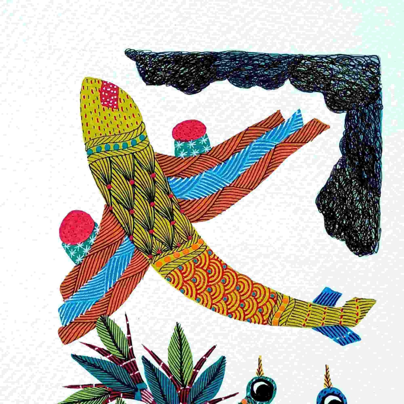The painting is made by a tribal artist Kailash Gond. He resides in the designated tribal area in the state of Chatiisgarh, India. He is an accomplished triba l artist and paints on paper, wood, cloth amongst other material. We can create a customised, thematic collection on any theme related to nature. All paintings come with his signature.