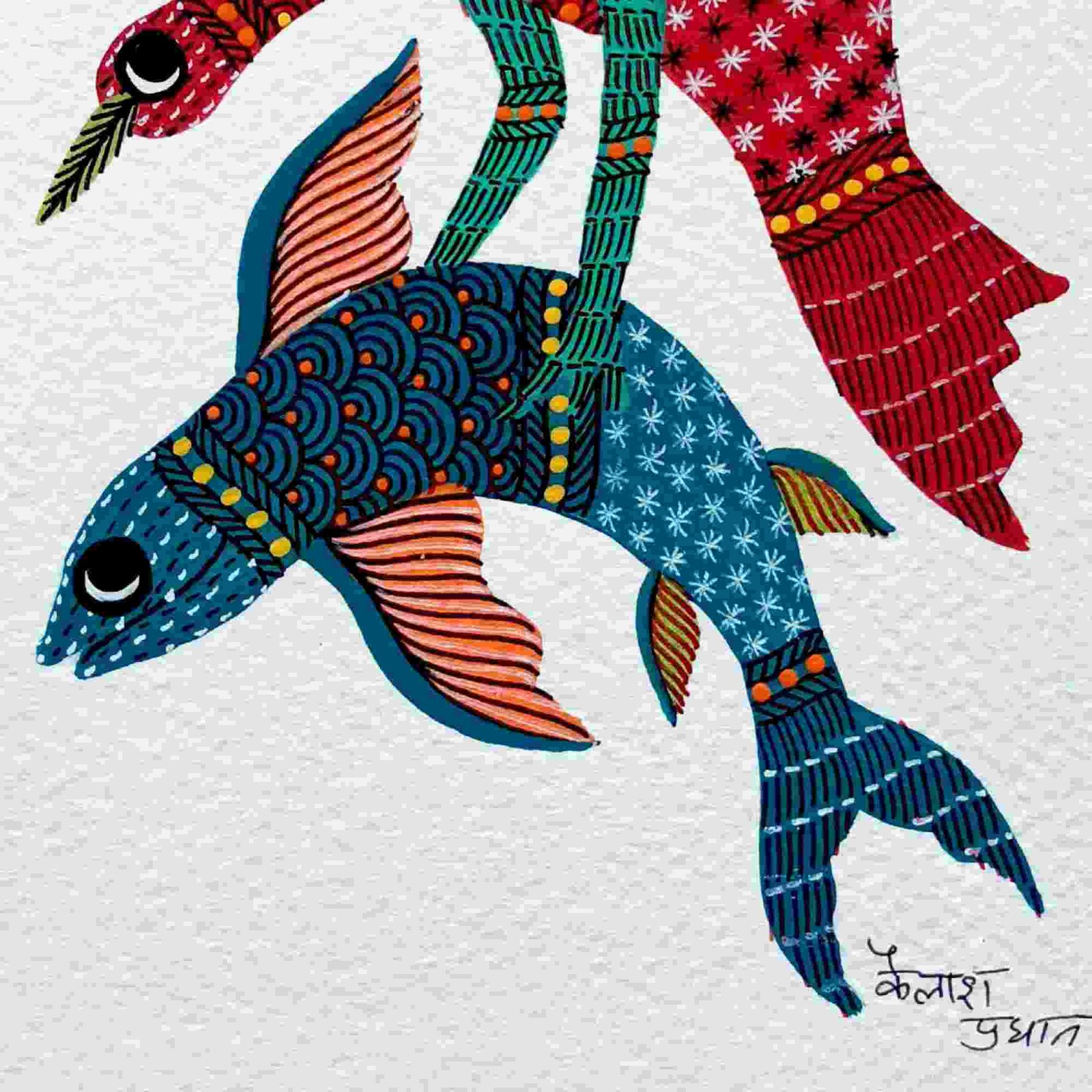 The painting is made by a tribal artist Kailash Gond. He resides in the designated tribal area in the state of Chatiisgarh, India. He is an accomplished triba l artist and paints on paper, wood, cloth amongst other material. We can create a customised, thematic collection on any theme related to nature. All paintings come with his signature.