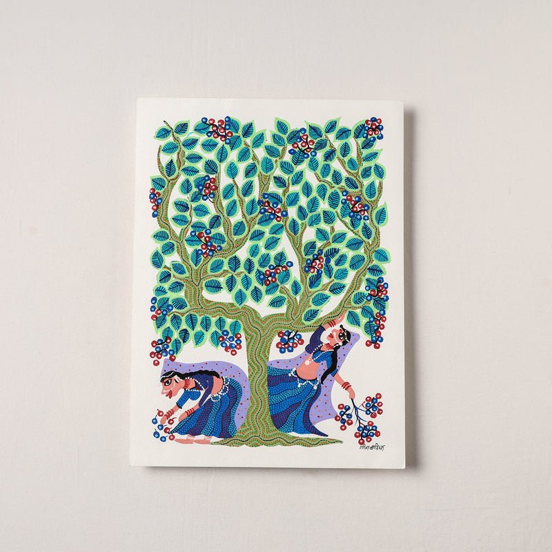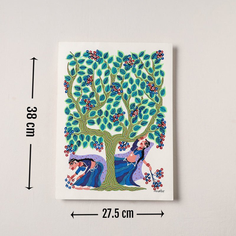 Traditional bhil pithora folk artwork on thick art paper with permanent ink & acrylic colours. This exquisite bhil art comes from the family of Geeta Bariya. Geeta is the daughter in law of Bhuribai famous Bhil artist. She learnt painting after she got married. She has participated in various workshops. The Bhils are the second largest tribe in India who reside in western and central India, in states of Madhya Pradesh, Gujarat, Rajasthan, and Maharashtra. The history of Bhil art is as old as the Bhils themselves. The art is simple images of everyday life of this tribe, the Bhils live close to nature and lead a largely agricultural life. Their paintings reflect the changing seasons, the natural phenomena that guide their harvest, and the gods that protect them. Their houses have beautiful frescos of images from myth and folklore on the walls and ceilings. Dots are the identity of Bhil art paintings. Dots of different colours on plain backgrounds are used to depict stories, memories and prayers. We can provide framing services as well at an additional cost. The cost for framing depends upon the quality of framing (with or without mount), width, lenght and quality of moulding etc. We recommend acrylic framing over the glass option, if you need to cover the painting.