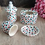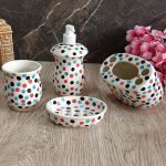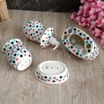 The bathroom set is made of high quality ceramic and hand painted by an expert artisan from Khurja, Uttar Pradesh. It comprises 4 items – soap dish, soap dispenser, brush holder and shaving kit holder. The dispenser knob is of high quality stainless steel and is rust and corrossion free. Various types of hand painting colors and designs are possible for a small batch production of 50 units. Product and quality certifications are available on request.