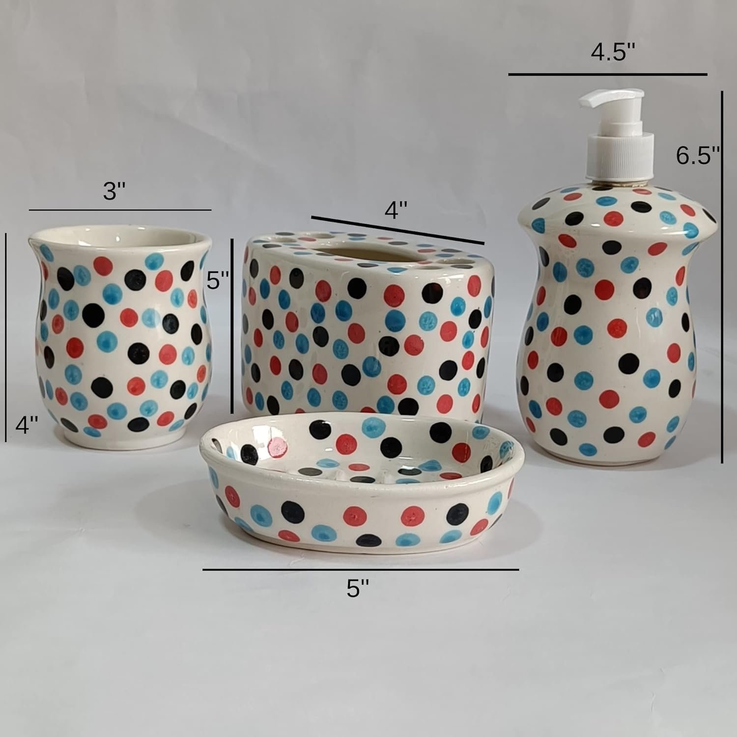 Length: Soap Dish -5 inch Dispenser-3 inch Holders-3 inch, Width: Soap Dish -5 inch Dispenser-3 inch Holders-3 inch, Height: Soap Dish -1 inch Dispenser-7 inch Holders-4 inch |