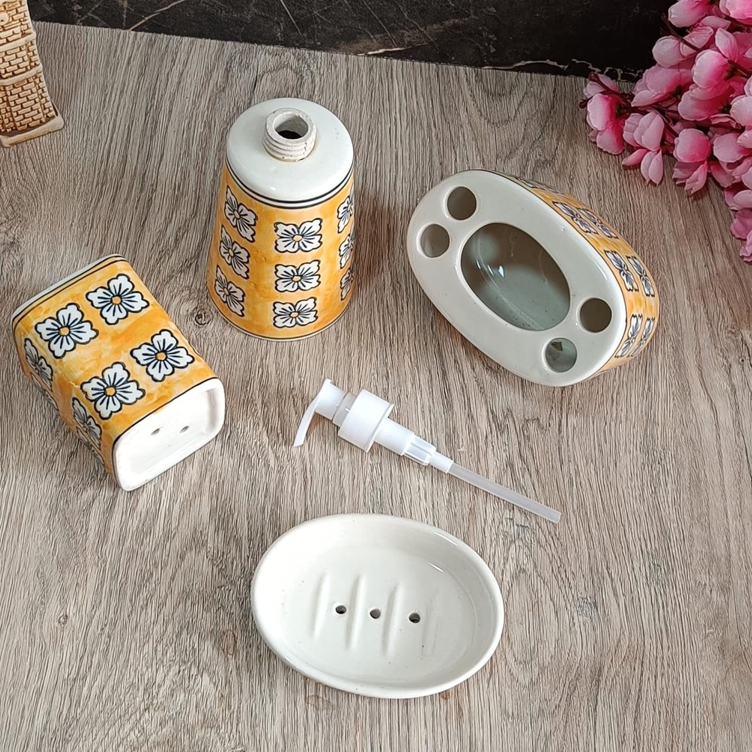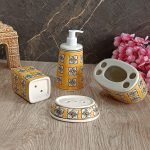 The bathroom set is made of high quality ceramic and hand painted by an expert artisan from Khurja, Uttar Pradesh. It comprises 4 items – soap dish, soap dispenser, brush holder and shaving kit holder. The dispenser knob is of high quality stainless steel and is rust and corrossion free. Various types of hand painting colors and designs are possible for a small batch production of 50 units. Product and quality certifications are available on request.