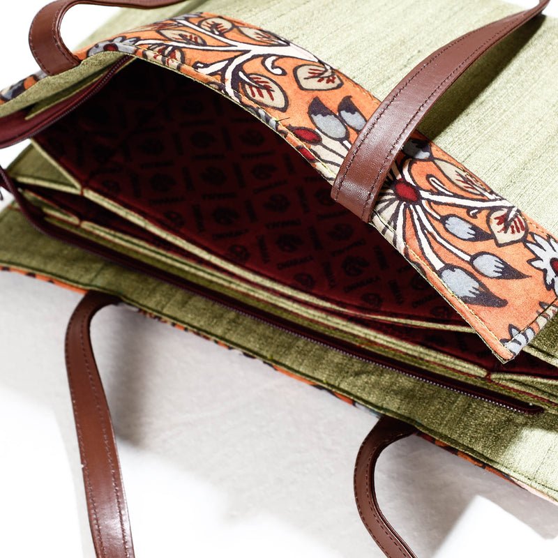 This Hand-painted kalamkari shoulder bag is crafted from natural dyed cotton and ghicha silk fabric, offering a blend of durability and elegance. The bag offers four sections inside, along with a zipper and magnetic snap button pocket, providing ample organization and secure storage options for everyday essentials and personal belongings. This exquisite shoulder bag is created with Hand-painted kalamkari work, wherein the kalam or pen is used for free hand drawing of the subject and filling in the colours. It is entirely hand worked using natural colours.