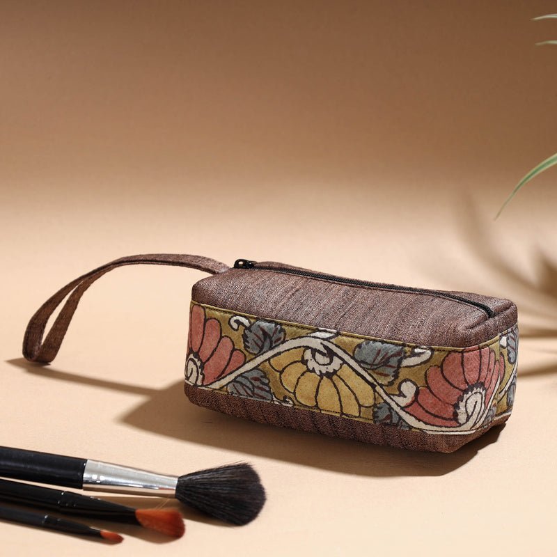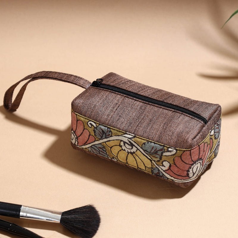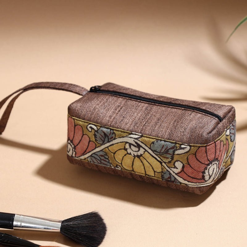 Elevate your style with our exquisite handpainted kalamkari natural dyed cosmetic/Toiletry pouch. This pouch is made from kalamkari natural dyed cotton and ghicha silk fabric. This multipurpose pouch is created with handpainted kalamkari, wherein the andquot;kalam,andquot; or pen, is used for free hand drawing of the subject and filling in the colours. It is entirely hand worked using natural colours. Perfect for cosmetics and Toiletryries, itand39;s a testament to the skilled artisans who use natural colors to create this stunning, unique piece. Experience artistry in everyday use with this exquisite pouch.