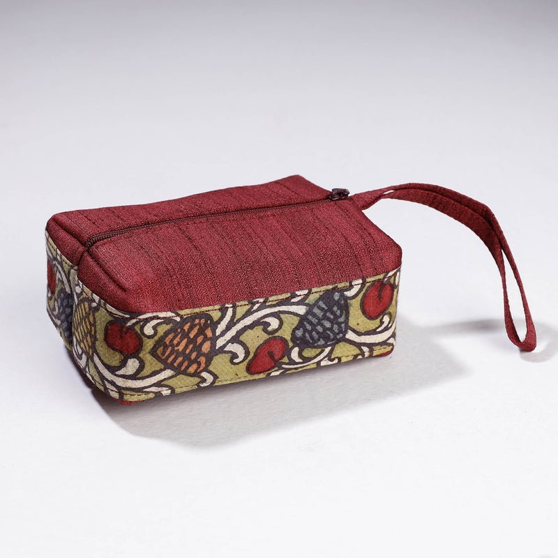Fine quality handpainted kalamkari natural dyed ghicha silk multipurpose cosmetic/ Toiletry pouch. This pouch is made from kalamkari natural dyed cotton and ghicha silk fabric. This multipurpose pouch is created with handpainted kalamkari, wherein the andquot;kalam,andquot; or pen, is used for free hand drawing of the subject and filling in the colours. It is entirely hand worked using natural colours.