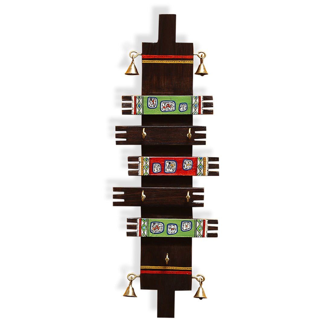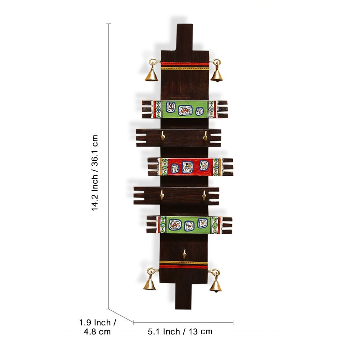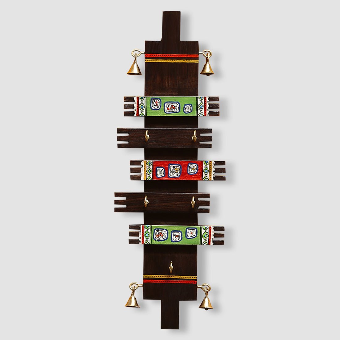 Warli Hand-Painted Key Holder In Pine & Teak Wood (6 Hooks)