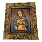 The wall painting is a unique artwork by an awarded Indian artisan. The frame is a solid wooden frame on which the 3D fibre figurine is mounted. The complete painting is hand painted using metallic and acrylic colors. A number of religious and cultural motifs are possible for a small batch production of 24 pcs.