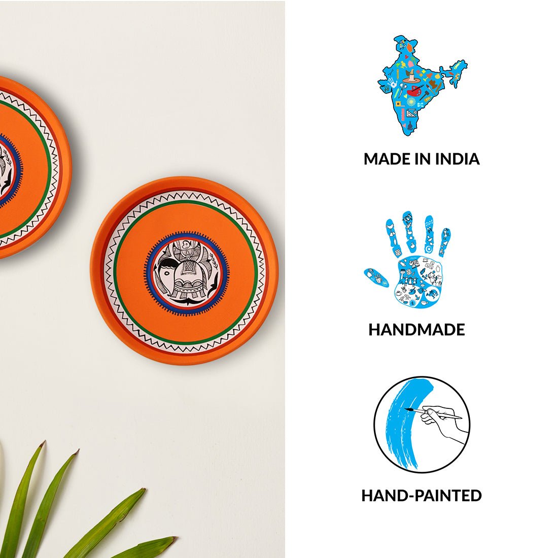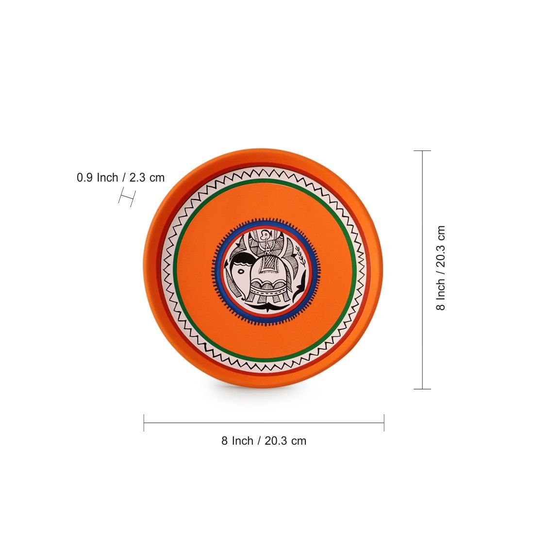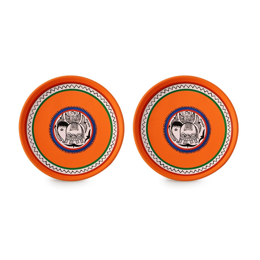 These plates are handmade and hand-painted by an awarded Indian artisan. They are made from good quality clay and hand-painted using acrylic colors. They represent Madhubani art forms that originates from Madhubani district in Bihar, India. Various shapes, sizes and designs are possible for a small batch production of 100 pieces. Existing designs are available for a minimum quantity of 24 pieces.