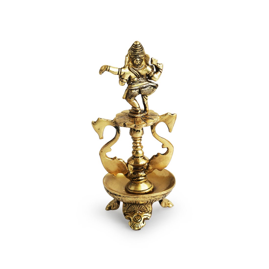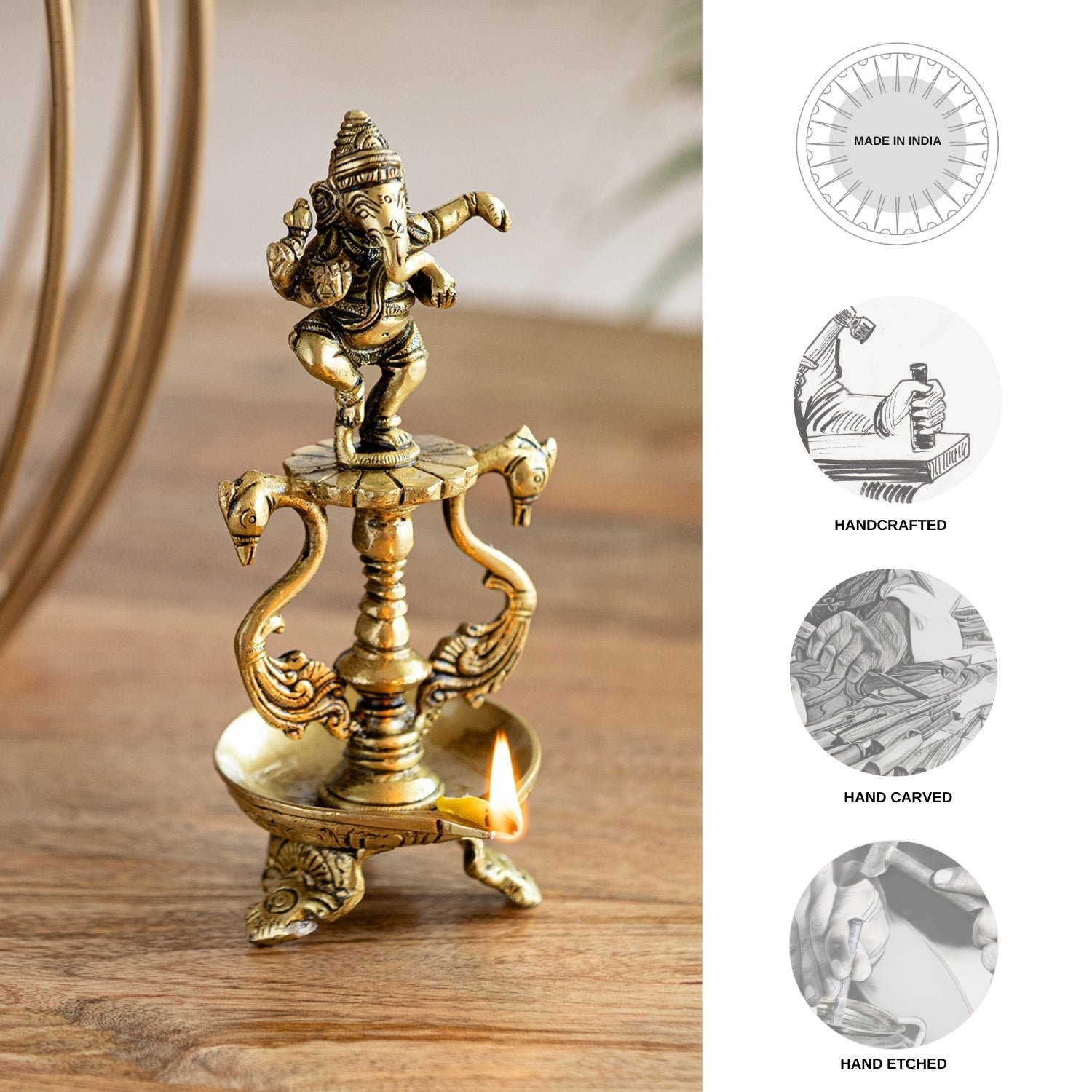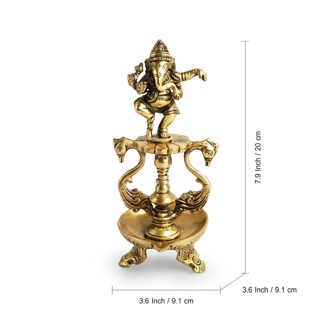 Handcarved Ganesha Brass Diya With Gem Work (1 Wick, 7.9 Inches, 20 ml, 0.8 Kg, Hand-Etched)