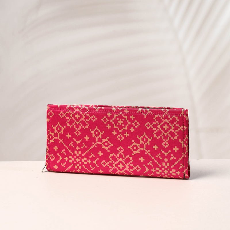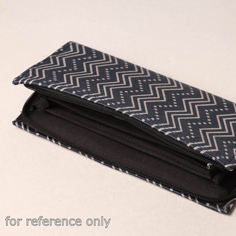 This clutch is handcrafted from ajrakh block printed mashru silk fabric by craftswomen in the Kutch region of Gujarat. It has two separate zipper pockets inside for coins and important documents and ample space to keep most of your essentials. It has a silk fabric lining inside.