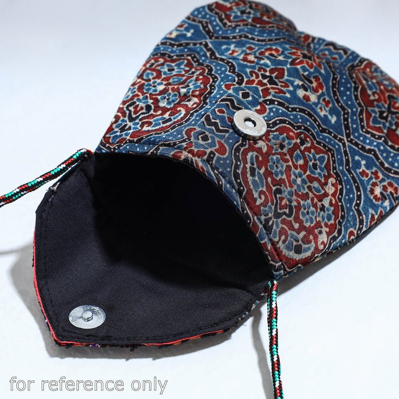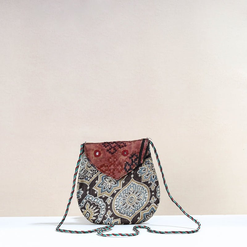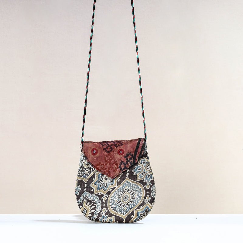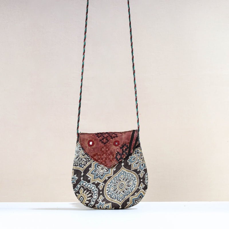Handcrafted sling bag with kutch embroidery flap. This sling bag is crafted from ajrakh block printed mashru silk fabric by craftswomen in the Kutch region of Gujarat. It has le space to keep most of your essentials. The Kutch Embroidery is a handicraft and textile signature art tradition of the tribal community of Kutch district in Gujarat.