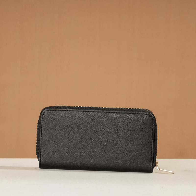 This handcrafted embroidered wallet is made from faux leather and embroidered fabric. It has three sections, ten card slots, and a zipper pocket inside.