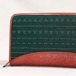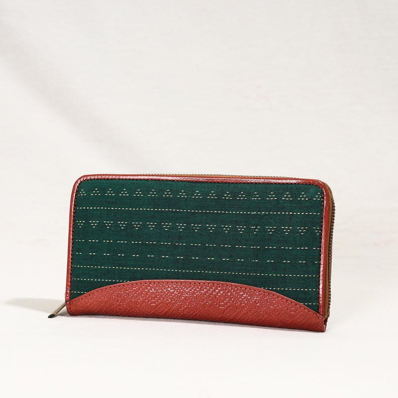 The wallet has a jacquard weave cover with leather border on the top. Leather used is vegetable-tanned, hand-painted leather. It is handcrafted by the master artisans of Kolkatta, West Bengal. It offers five card slots, a secure zipper pocket, three cash compartments and a snap-button pocket. The design and structure can be customised for a small batch production of 50 pieces.
