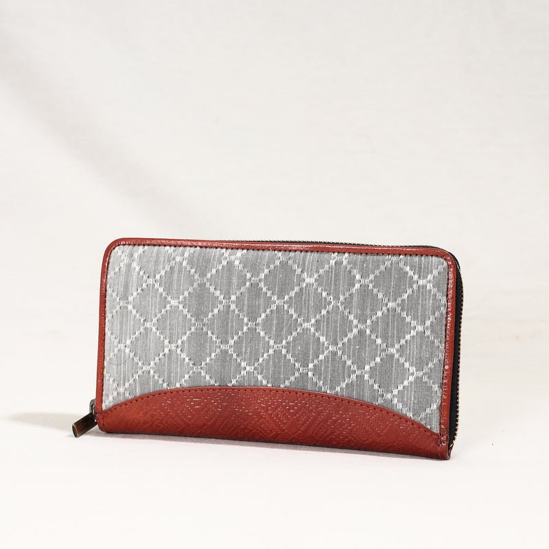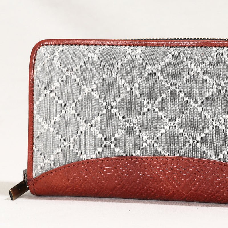 The wallet has a jacquard weave cover with leather border on the top. Leather used is vegetable-tanned, hand-painted leather. It is handcrafted by the master artisans of Kolkatta, West Bengal. It offers five card slots, a secure zipper pocket, three cash compartments and a snap-button pocket. The design and structure can be customised for a small batch production of 50 pieces.