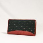 The wallet has a jacquard weave cover with leather border on the top. Leather used is vegetable-tanned, hand-painted leather. It is handcrafted by the master artisans of Kolkatta, West Bengal. It offers five card slots, a secure zipper pocket, three cash compartments and a snap-button pocket. The design and structure can be customised for a small batch production of 50 pieces.