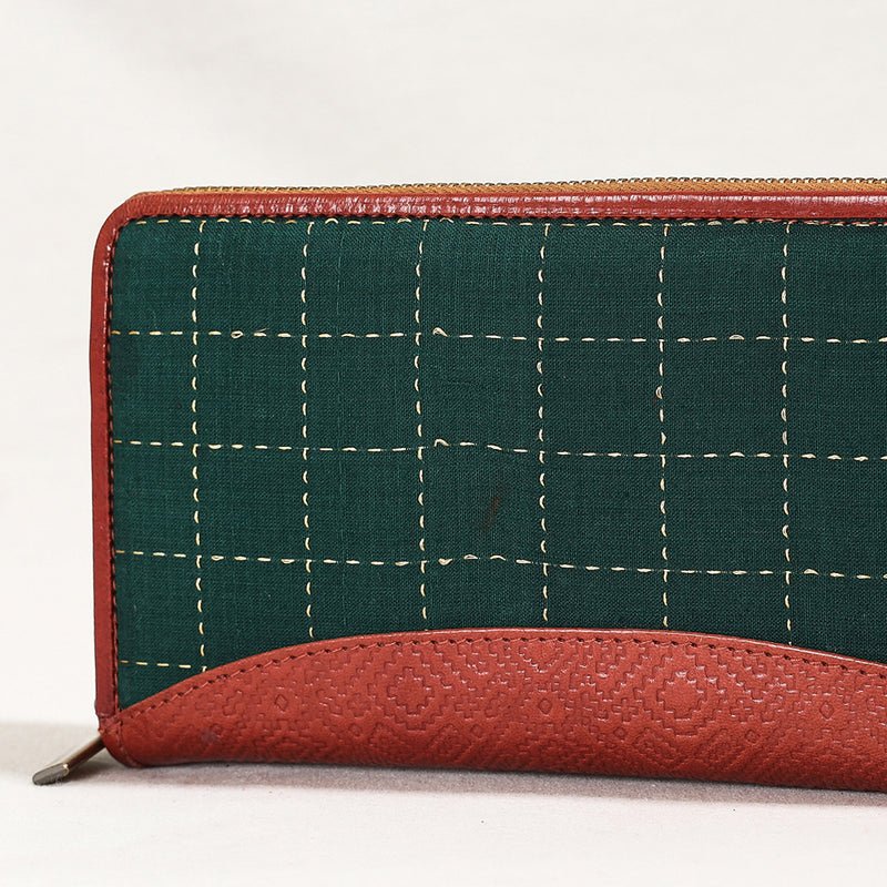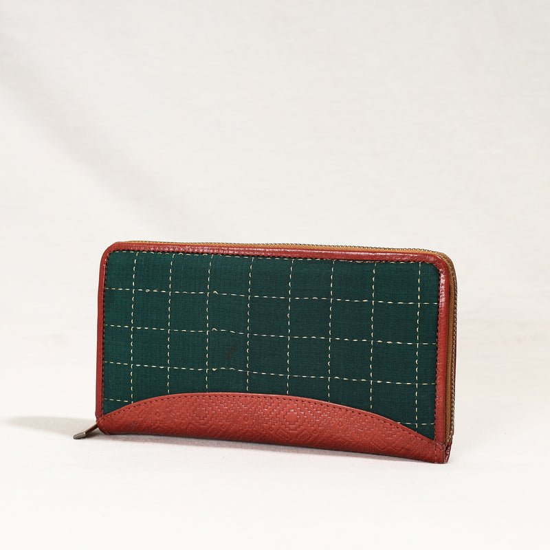 The wallet has a jacquard weave cover with leather border on the top. Leather used is vegetable-tanned, hand-painted leather. It is handcrafted by the master artisans of Kolkatta, West Bengal. It offers five card slots, a secure zipper pocket, three cash compartments and a snap-button pocket. The design and structure can be customised for a small batch production of 50 pieces.
