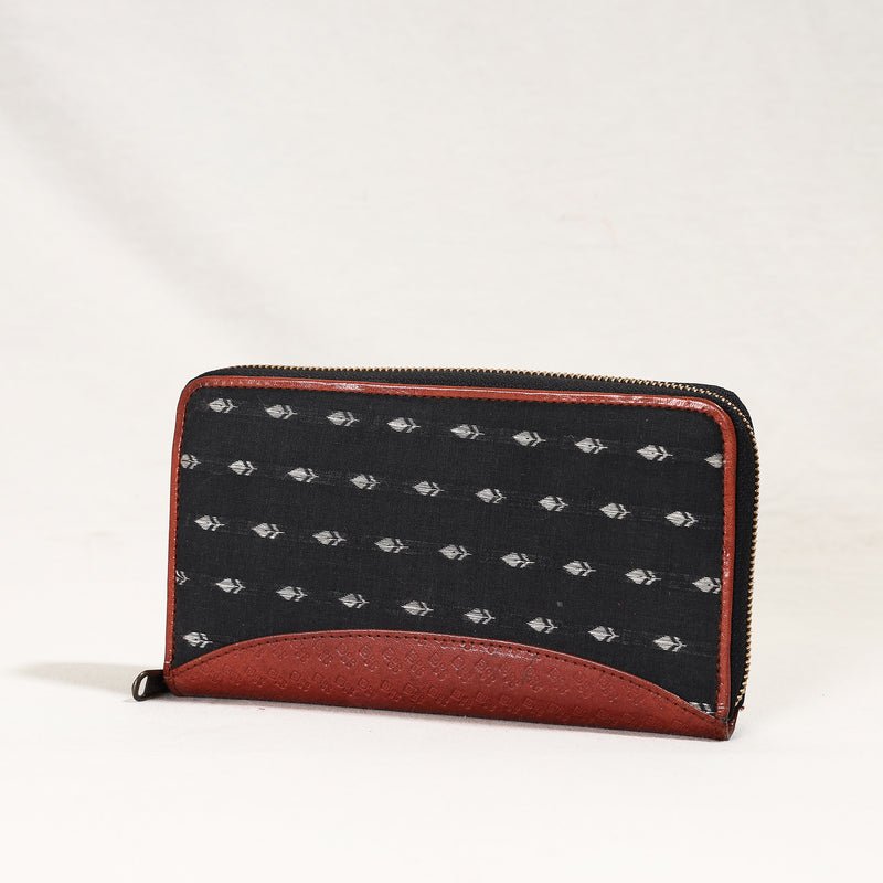 The wallet has a jacquard weave cover with leather border on the top. Leather used is vegetable-tanned, hand-painted leather. It is handcrafted by the master artisans of Kolkatta, West Bengal. It offers five card slots, a secure zipper pocket, three cash compartments and a snap-button pocket. The design and structure can be customised for a small batch production of 50 pieces.