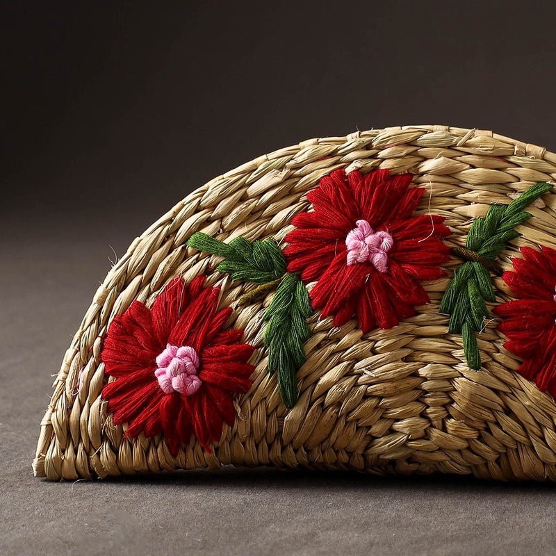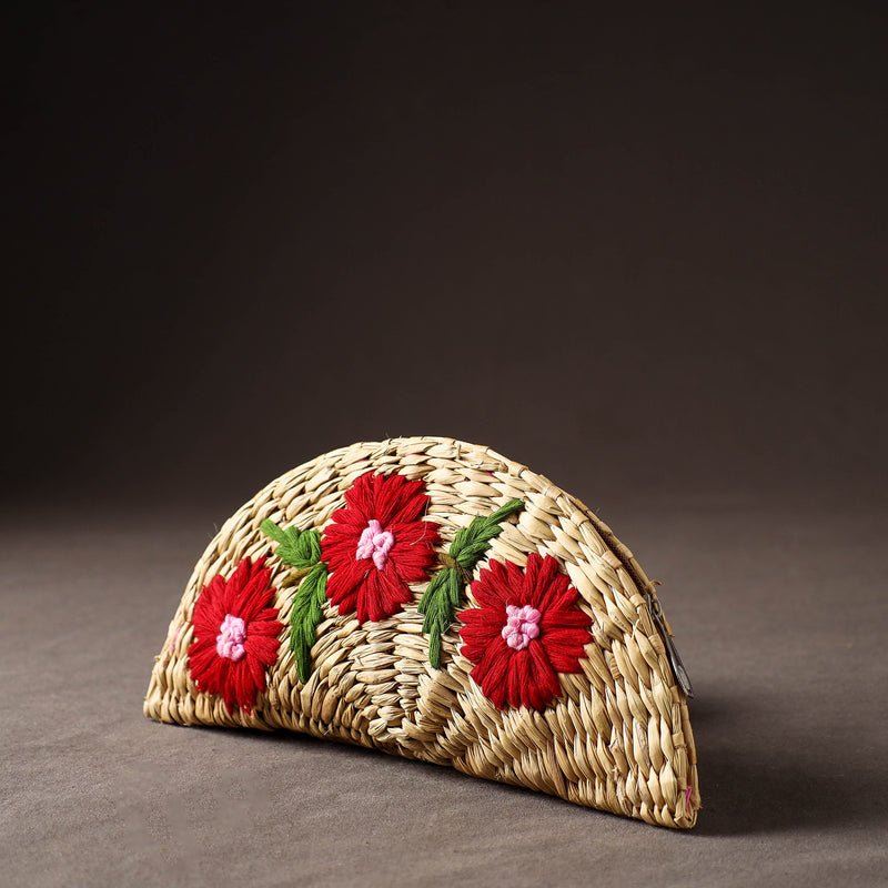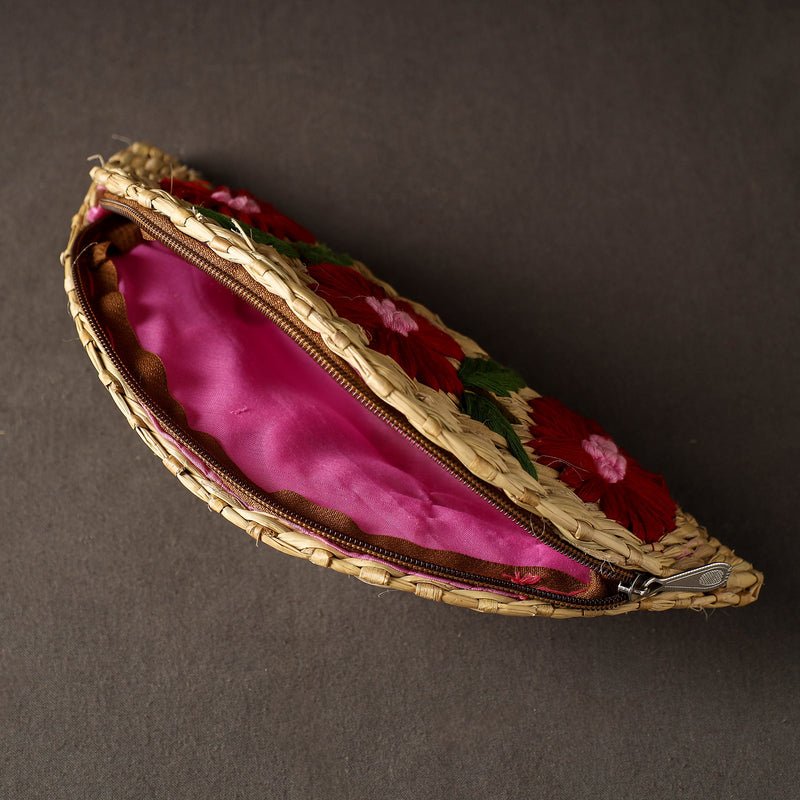 This exquisite handcrafted clutch from Manipur is made of natural water reed and adorned with intricate hand embroidery. The bag showcases the rich cultural heritage of Manipur, known for its traditional craftsmanship. Made from durable and eco-friendly water reed, the bag is perfect for everyday use. It offers le space for important documents, money and cards . The vibrant hand embroidery adds an artistic touch, depicting traditional patterns and nature-inspired designs. With secure zipper closure, this bag combines traditional charm with contemporary style, making it a versatile and fashionable accessory for any occasion.