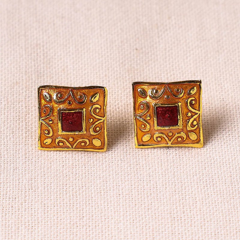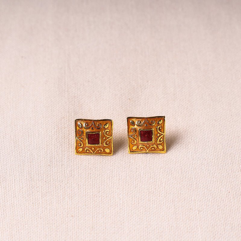 Experience the allure of tradition with Sukhomoy Mukherjee's handcrafted Paka Meenakari stud earrings. Meticulously crafted from a bronze alloy, these earrings showcase the ancient art of Meenakari, where vibrant colours fuse into intricate designs. Meenakari is the art of colouring and ornamenting the surface of metals by fusing over them brilliant colours that are decorated in an intricate design. The Mughals invented the art of enamel or meenawork metalcraft, and it was popular with both the Mughals and the Hindu princes of Rajasthan, where it was used for creating precious objects and enriching jewellery.