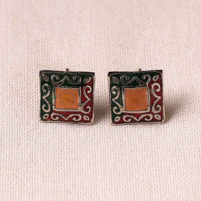 Experience the allure of tradition with Sukhomoy Mukherjee's handcrafted Paka Meenakari stud earrings. Meticulously crafted from a bronze alloy, these earrings showcase the ancient art of Meenakari, where vibrant colours fuse into intricate designs. Meenakari is the art of colouring and ornamenting the surface of metals by fusing over them brilliant colours that are decorated in an intricate design. The Mughals invented the art of enamel or meenawork metalcraft, and it was popular with both the Mughals and the Hindu princes of Rajasthan, where it was used for creating precious objects and enriching jewellery.