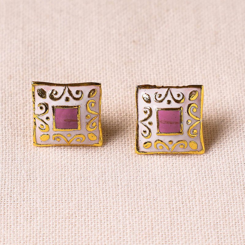 Experience the allure of tradition with Sukhomoy Mukherjee's handcrafted Paka Meenakari stud earrings. Meticulously crafted from a bronze alloy, these earrings showcase the ancient art of Meenakari, where vibrant colours fuse into intricate designs. Meenakari is the art of colouring and ornamenting the surface of metals by fusing over them brilliant colours that are decorated in an intricate design. The Mughals invented the art of enamel or meenawork metalcraft, and it was popular with both the Mughals and the Hindu princes of Rajasthan, where it was used for creating precious objects and enriching jewellery.