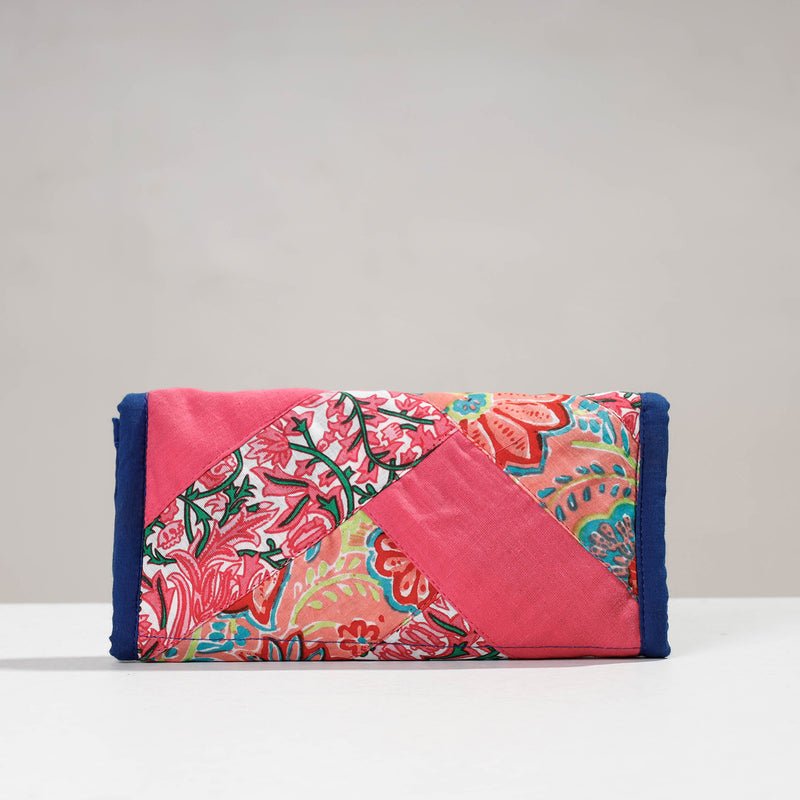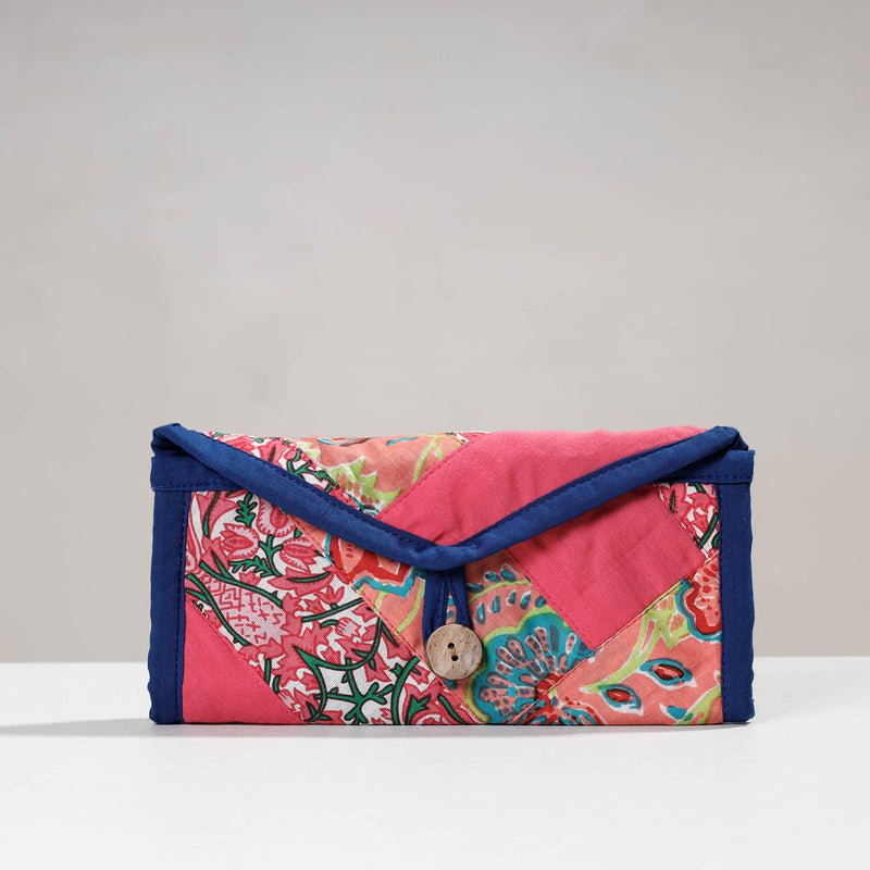 This two fold wallet is made using hand block printed cotton fabric. The design form is patchwork. The wallet features one cash compartment, three convenient card slots, a secure velcro lock pocket, and a secure zipper pocket. It is made by women groups of Delhi NCR region. The design and foramtion can be customised for a small batch size of 100 units.