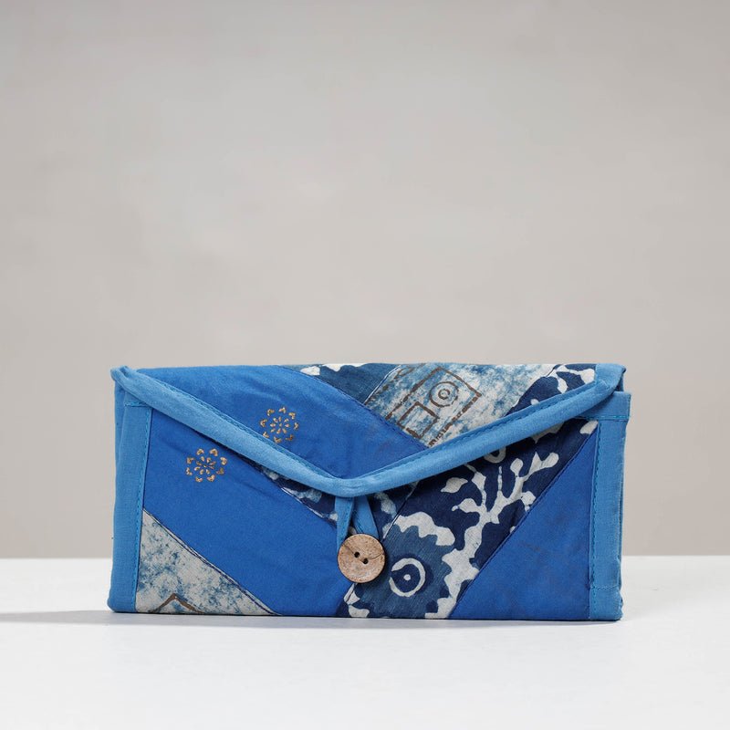 This two fold wallet is made using hand block printed cotton fabric. The design form is patchwork. The wallet features one cash compartment, three convenient card slots, a secure velcro lock pocket, and a secure zipper pocket. It is made by women groups of Delhi NCR region. The design and foramtion can be customised for a small batch size of 100 units.