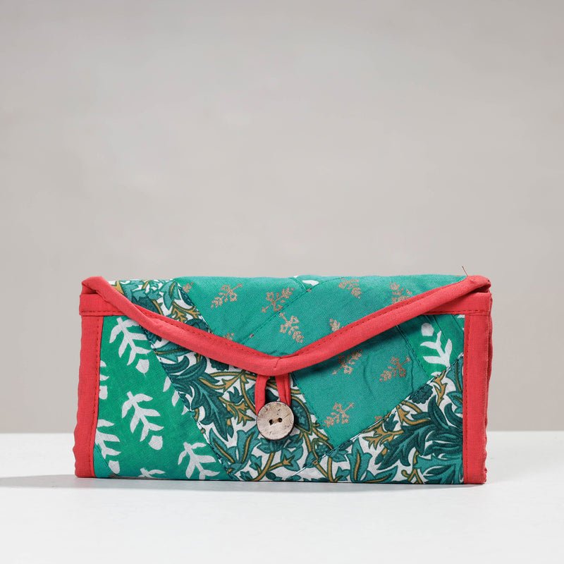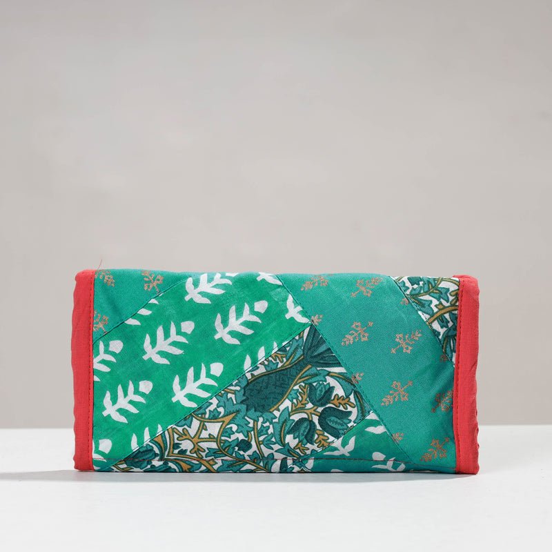 This two fold wallet is made using hand block printed cotton fabric. The design form is patchwork. The wallet features one cash compartment, three convenient card slots, a secure velcro lock pocket, and a secure zipper pocket. It is made by women groups of Delhi NCR region. The design and foramtion can be customised for a small batch size of 100 units.