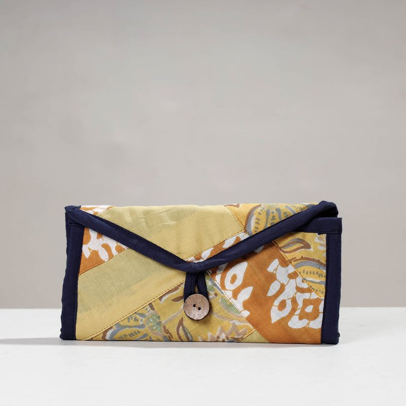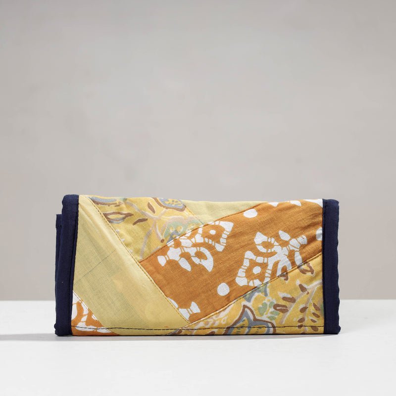 This two fold wallet is made using hand block printed cotton fabric. The design form is patchwork. The wallet features one cash compartment, three convenient card slots, a secure velcro lock pocket, and a secure zipper pocket. It is made by women groups of Delhi NCR region. The design and foramtion can be customised for a small batch size of 100 units.