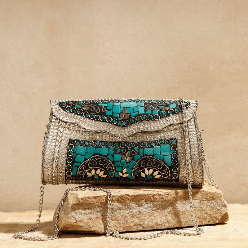 Handmade Vintage Metal & Mosaic Stone Clutch / Sling Bag