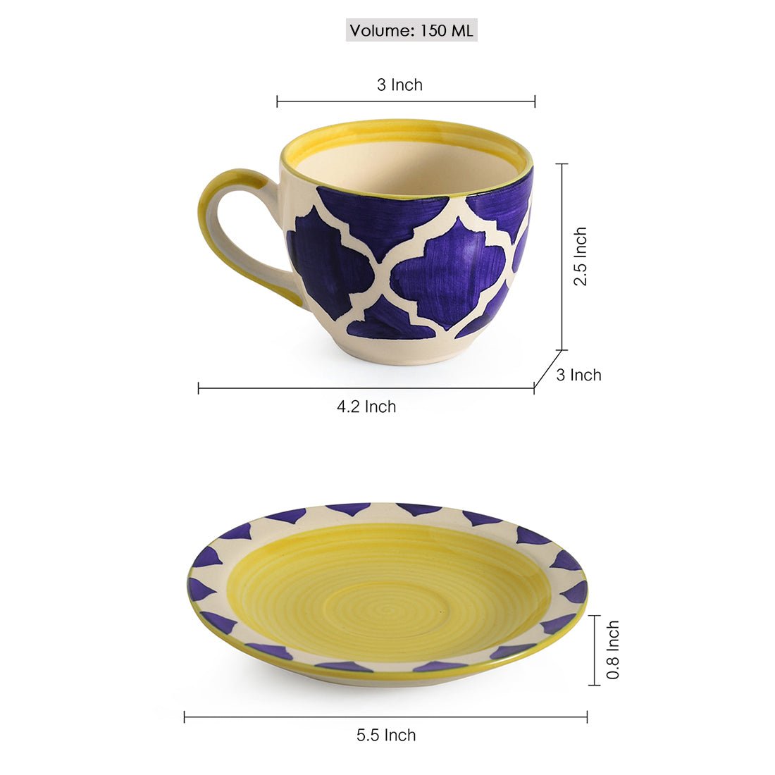 The cups are made from a high quality clay. Making them microwave safe. They are either Hand-glazed or hand painted by expert artisans from Khurja. The handles are strong and offer a good grip. Hand wash recommended. We can customise the size, shape, design and color for a small batch production of 100 units. Quality testing reports and material testing certificates are provided on request.