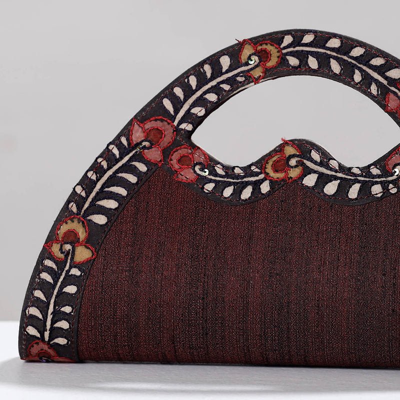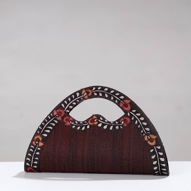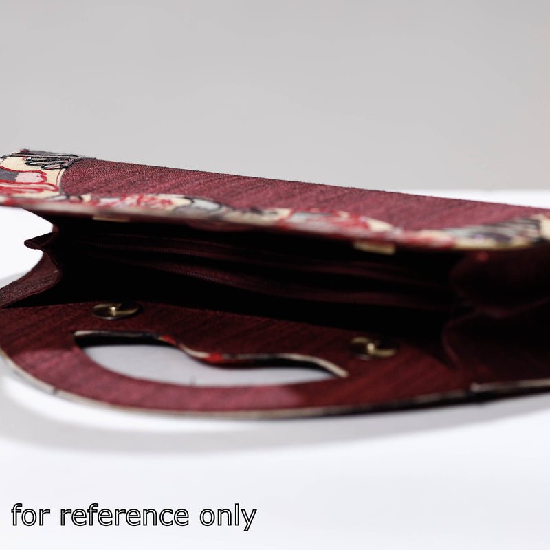 This Kalamkari natural dyed ghicha silk clutch/wallet is made by skilled artisans of Andhra Prades. The clutch has five pocket. This exquisite clutch bag is created with handpainted kalamkari work and Zari work, wherein Kalam or pen is used for free hand drawing of the subject and then it is filled using natural colours. We can customise the design, features and color provided the minimum order quanity is 36 pcs.