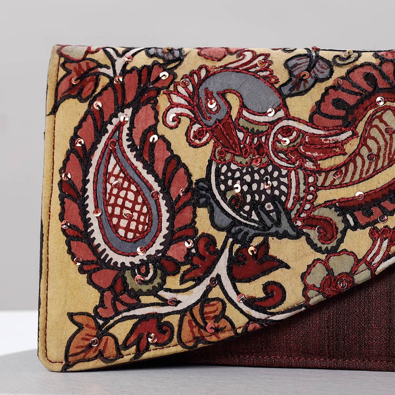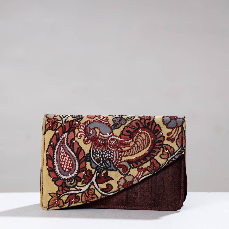 This Kalamkari natural dyed ghicha silk clutch/wallet is made by skilled artisans of Andhra Prades. The clutch has five pocket and come with magnetic snap button closure. This exquisite clutch bag is created with handpainted kalamkari work and Zari work, wherein Kalam or pen is used for free hand drawing of the subject and then it is filled using natural colours. We can customise the design, features and color provided the minimum order quanity is 36 pcs.