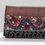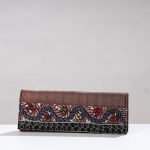 This Kalamkari natural dyed ghicha silk clutch/wallet is made by skilled artisans of Andhra Prades. The clutch has five pocket and comes with magnetic snap button closure. This exquisite clutch bag is created with handpainted kalamkari work and Zari work, wherein Kalam or pen is used for free hand drawing of the subject and then it is filled using natural colours. We can customise the design, features and color provided the minimum order quanity is 36 pcs.