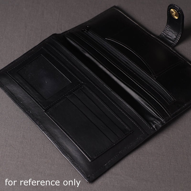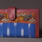 Fine quality handpainted kalamkari natural dyed cotton fabric and leather embellished clutch/wallet. It has one zipper, four simple pockets and six card slots inside. This exquisite clutch is created with handpainted kalamkari work, wherein the kalam or pen is used for free hand drawing of the subject and filling in the colours. It is entirely hand worked using natural colours.