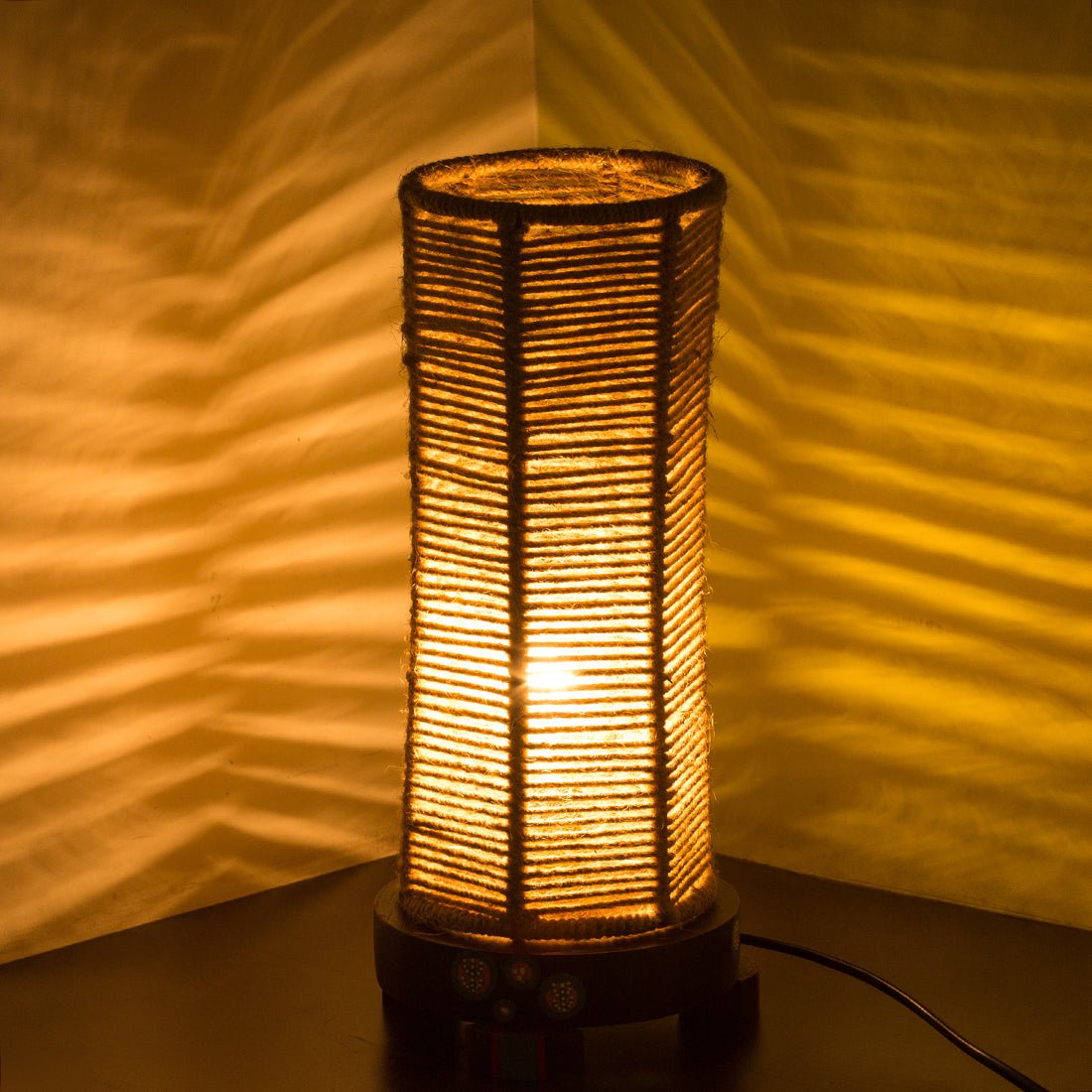 The lamp is made from a high quality hard wood. Top top is made of Jute, Linen, Cmabirc cotton wrapped over Polyvinyl. Bulb holder Type is B22. Comes with 2 pin plug. Comes with an On/Off switch. Wire Length is 1.6 meters. Various shapes, sizes and designs are possible for a small batch production of 100 pieces. Existing designs are available for a minimum quantity of 24 pieces.