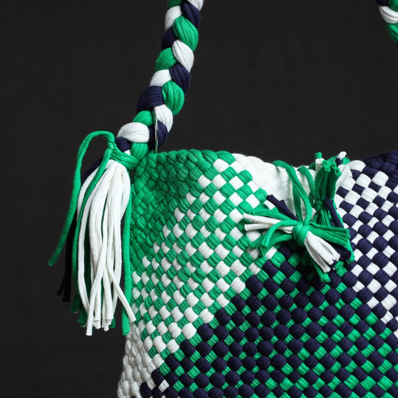 Fine quality handwoven upcycled cotton shoulder bag. Multi purpose shoulder bags are a light and easy way to carry bare essentials like wallets, phones, keys, any small gadgets. Perfect for work like semi formal or casual outings. Handy sizes being 13?? x 13?? with a smartly braided 13?? handle for shoulder carry, making them a perfect choice for setting trends.