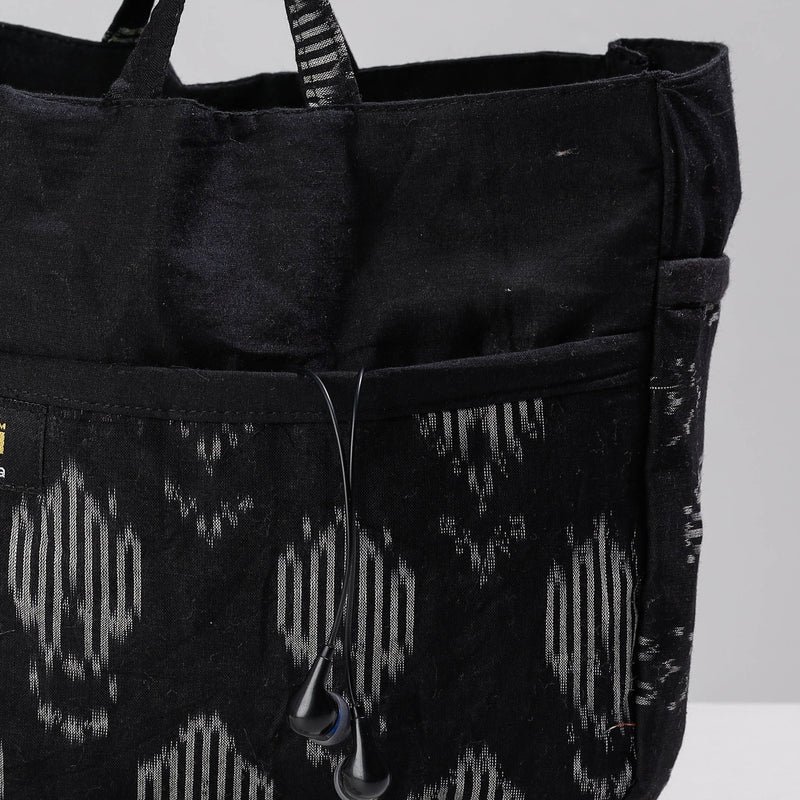 Handcrafted multipurpose cosmetic/Toiletry pouch. It has two simple pockets, one zipper pocket inside and four pockets on outside. This pouch is made from pochampally ikat cotton fabrics with spill-proof plastic layer lining inside, textured with handmade textiles of India.